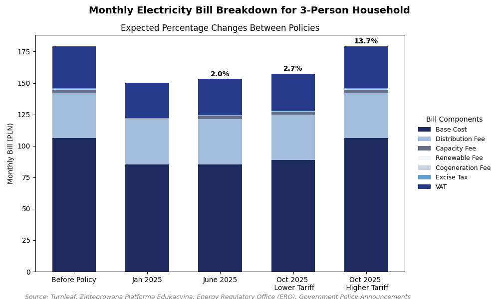 By June 2025, the capacity fee is reinstated at 30 PLN/month, resulting in a modest 2% increase in bills. This stage shows the sensitivity of household costs to even minor changes in energy policy. Although the cap remains, incremental additions like the capacity fee gradually erode the savings provided by the price control.